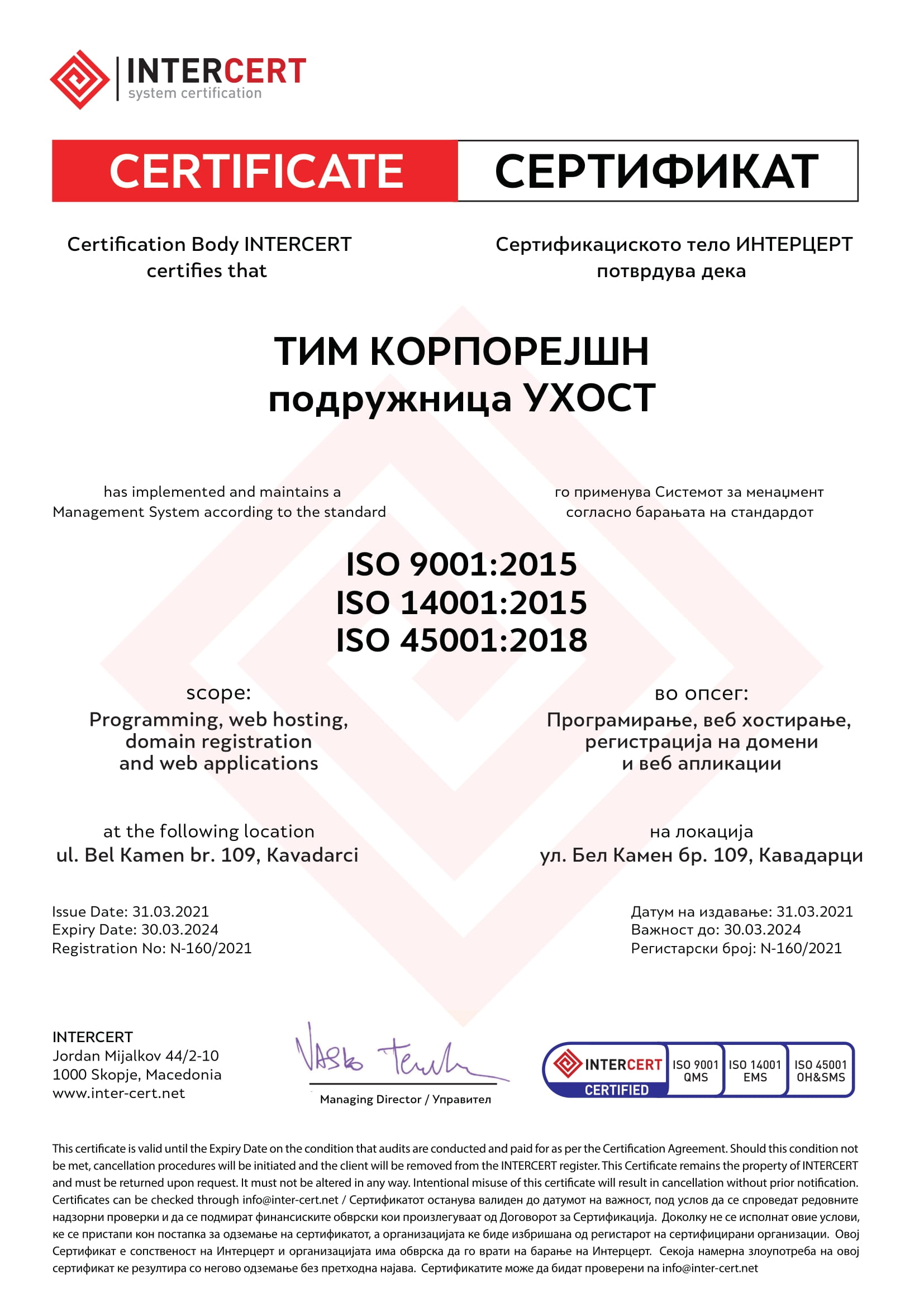 - - Примена на законската легислатива, задоволување на барањата на стандардите ISO 20000-1:2018 и ISO 9001:2015 и постојано подобрување на квалитетот на работните процеси и услугите кон нашите корисници;